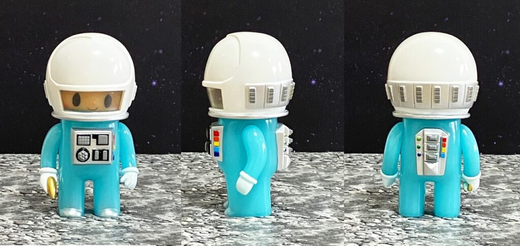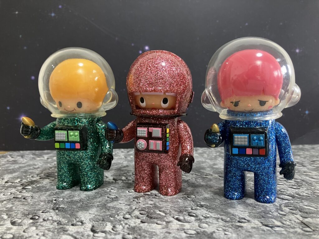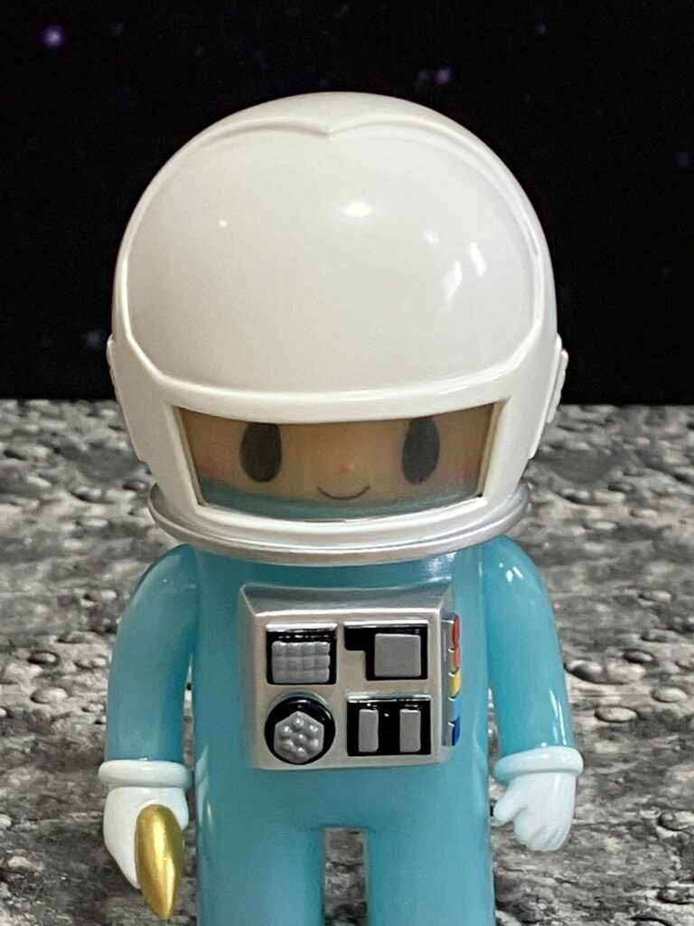 今回撮影した薄い水色のはBlue GIDバージョン。最近は、グリッターが散りばめられたバージョン。ピンク、ブルー、グリーンの3色で、宇宙空間をイメージしたキラキラのラメが宇宙服全体に入っています。クリアドームのヘルメットの中の可愛らしい顔とのギャップが魅力です。