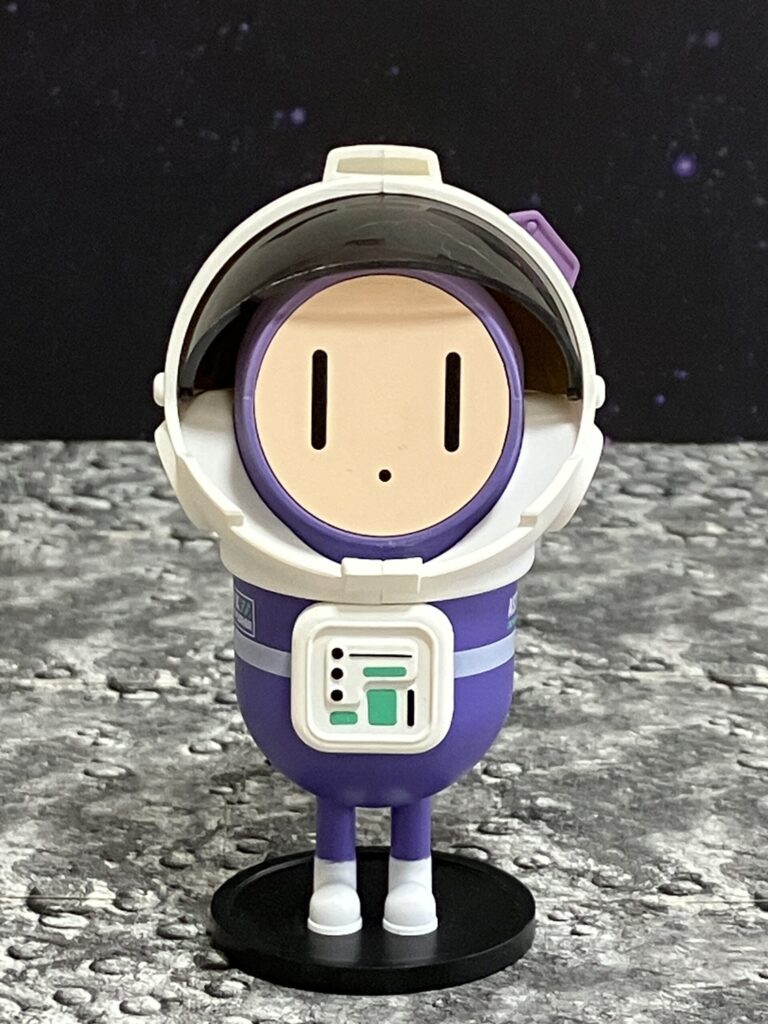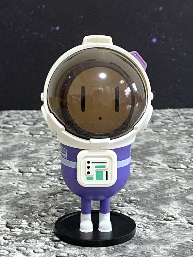 加湿器本体のコックピットにMIXの頭部をマグネットで装着する仕組みで、乗せると内部のライトが赤・青・白に光り、ミストの噴射も始まるというスイッチの役割も兼ねています。単体で見ると、全高約8.5cmで腕がなくカプセル型のボディに細い脚だけという極めてシンプルなデザインですが、おとぼけ顔の表情と紫色のカラーリングが妙に愛嬌があります。この体があるMIXフィギュアは加湿器トイとは別売りの商品になりあす。設定では宇宙人ということですが、デザイン的に宇宙飛行士コレクションに混ぜてみたら、意外としっくり馴染みました。